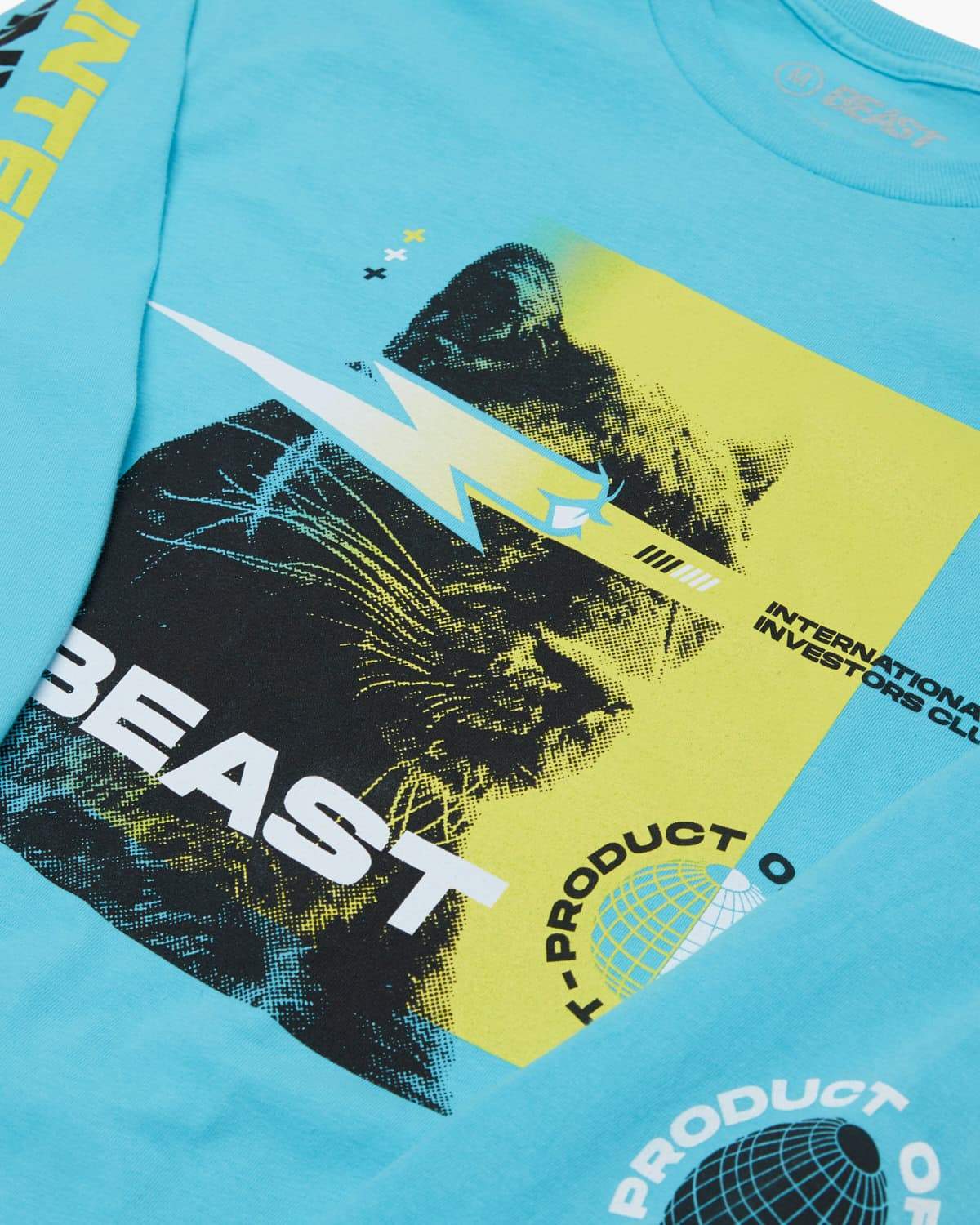 • Printed on a lagoon blue, 100% cotton long sleeve tee • Printed with soft hand inks so print is soft to the touch • Front and dual sleeve decorations • Custom printed neck/size tag • Seamless non-topstitched collar • Shoulder to shoulder taping • Cuffed sleeves • Double needle stitching on bottom hem